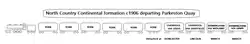 ENGINE+THIRD CLASS BRAKE+CORRIDOR THIRD+OPEN THIRD+KITCHEN AND OPEN FIRST+SEMI-OPEN FIRST+SIX WHEEL BRAKE (this constituted the York portion). Then followed various corridor composite brakes followed each detached from the rear of the northbound train en route. These were for LIVERPOOL (detached Doncaster on the outward journey)+ LIVERPOOL + MANCHESTER(detached at Lincoln and routed via the Great Central routes) + BIRMINGHAM (via Midland Railway routes) + BIRMINGHAM (via London and North Western routes)(both of which were detached at March).[25]