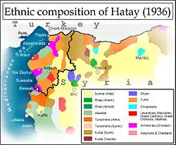 According to the estimates of the French High Commission in 1936, out of a population of 220,000, 39% were Turks, 28% Alawite Arabs, 11% Armenians, 10% Sunni Arabs, 8% other Christians and 4% were Circassians, Kurds and Jews. Although Turks formed the largest single ethno-religious group, Arabic speakers, including Sunnis, Alawites and Christians, were more numerous.[6]