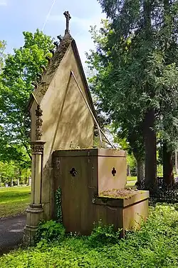 The Hauptfriedhof contains historic graves and monuments, interesting for historians and art historians. There are graves for single people, families, and also groups, including victims of wars, French soldiers,[3][6] and Deutscher Ehrenhof honorary graves.[7] The cemetery features two Gruftenstraßen (grave roads) with high monuments of important Mainzer families. The oldest gravestone dates to 1805. 230 gravestones and monuments are listed historic monuments.[3]