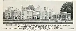 The priory and it's land was then up for sale.[6][7] It did not attract any buyers who wanted to live there. Eventually it did sell to the demolition company RUDD of Grantham. Most of the stone structure of Haverholme was sold in 1926 by RUDD to an American woman who planned to reassemble it in America. The cargo of stonework was on a dock in Liverpool when the buyer became a victim in a train crash. Eventually the stones, never shipped to America, were used to build new docks.[8]