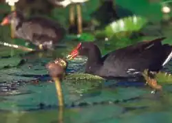 The gallinules are secretive birds, spending much time in dense wetland vegetation. While feeding in the open they will quickly seek cover when disturbed.[4] At some locations, however, individuals are quite tame and will even approach humans. Despite the lack of webbing or lobes on their toes, the birds are good swimmers.[5] They moult over a period of about 25 days each year, normally between June and September, when they are unable to fly and so more vulnerable to predation.[8]