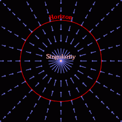 Alternatively, using a set of infalling coordinates in general relativity, one can conceptualize the event horizon as the region beyond which space is infalling faster than the speed of light. (Although nothing can travel through space faster than light, space itself can infall at any speed.)[6] Once matter is inside the event horizon, all of the matter inside falls inevitably into a gravitational singularity, a place of infinite curvature and zero size, leaving behind a warped spacetime devoid of any matter; a classical black hole is pure empty spacetime, and the simplest (nonrotating and uncharged) is characterized just by its mass and event horizon.[5]: 37–43