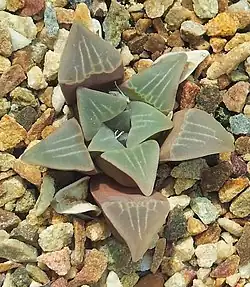 Haworthia mutica is a species of succulent plant native to South Africa's Cape Province.[1] Very similar to, and often confused with, types such as Haworthia retusa, the species has blunt, triangular shaped leaves that are typically striated. In the wild it rarely offsets, though clones in cultivation may do so readily.[2] The variety H. mutica var nigra is similar but with darker (nearly black) leaf color.[3]