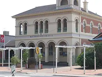 Hay Post Office is a prominent member of the Witcombe Place group of historic buildings in the civic centre of Hay, which greatly contribute to the character of the town. This group includes the Shire Offices (former 1896 court house), the Department of Land and Water Conservation and the present Westpac Bank.[1]