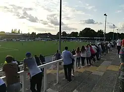 The banking was later replaced by concrete terracing, with both ends of the pitch later covered.[6] The original stand burned down in October 1992,[6] and was replaced by a much smaller 320-seat stand, which was opened the following year.[5] Seats obtained from the London Aquatics Centre were installed behind one goal to meet ground grading regulations after promotion to the National League.[6]