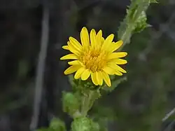 The composite flowers have a radiate head, with disk flowers in the center surrounded by ray flowers, colored yellow and aging to a dark red to purple. The composite flowers are borne either solitary at the ends of branches, sessile in a racemose capitulescence, or on leafy peduncles that grow up to 3 cm (1.2 in) long. The involucres are shaped like a broad, inverted cone or bell, and are shorter than the disk. The involucres measure 1–2 cm (0.39–0.79 in) high by 1–1.5 cm (0.39–0.59 in) wide, and have 30 to 60 erect bracts.[7][8]