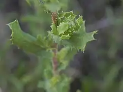 The branches of this species are 3–30 mm (0.12–1.18 in) in diameter and reach 5–10 dm (20–39 in) in length, and are covered with sparse, villous hairs (trichomes). The branches are leafy throughout, with the internodes measuring around 1–2.5 cm (0.39–0.98 in), usually with small fascicles in the axils. The leaves are sessile, and are shaped ovate-oblong to oblong, 1.5–5 cm (0.59–1.97 in) long and 3–18 mm (0.12–0.71 in) wide. Most of the leaf is usually free of hair. On the lower surface of the leaf is a prominent midrib, towards the base of which the only hairs on the leaf may be found. The margins of the leaf are distinctly dentate, with acute and spiny serrations throughout.[7][8]