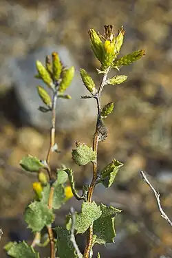 The leaves range from sessile to subpetiolate, rarely with auriculate-clasping or subclasping bases, and are shaped obovate to spatulate with obtuse to rounded-acute tips. The leaves measure 10–25 mm (0.39–0.98 in) long by 5–12 mm (0.20–0.47 in) and 1–2 mm (0.039–0.079 in) wide at the base. The leaf margins are mostly dentate, and have 2 to 8 teeth per margin, with a small white spine on the tip of each tooth, although sometimes the leaf margins may be entire on their lower half. The leaves have a coriaceous texture, and are conspicuously glandular-pitted or somewhat rugose in youth, and are typically green with a whitish exudate.[5][4] The plant produces numerous flower heads each head with 12-30 yellow disc flowers but no ray flowers.