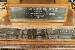 The Saskatchewan Major Baseball League (SMBL) was the highest level of collegiate summer baseball played in Saskatchewan up until the year 2000 when the name was changed to the Western Major Baseball League. Other teams included the Regina Red Sox, Moose Jaw Astros, Kindersley Royals, Saskatoon Liners, Eston Ramblers, Saskatoon Nationals, Oyen Pronghorns, and the Unity Cardinals. 1982 was the first year in the SMBL, and their first game attracted over 400 fans. The team finished last in the league that year.[11] In 1983 and 1984 they lost in the league final. It was in 1987 the Elks won their first league championship by defeating the Kindersley Royals. The Hazlet Elks went on to three-peat as SMBL champions by taking the league title in 1987, 1988, and 1989. The achievements of this team were notable as the population of Hazlet was around 125 people. It was truly a community effort to make the team viable. An executive of 14 members helped co-ordinate volunteer hours by themselves and others in the community. Among these were Vince Akre, Don Anderson, Terry Bailey, Bill Boss, Peter Buchanan, Donnie Knutson, Harvey McIntosh, Sandy Starkey, Barry Stock, Mark Stock, Lyle Thoreson, and Donnie Zinn. Larry English was the general manager. They were competing against cities and towns in Saskatchewan that were several times the population of Hazlet. Hazlet was the smallest town to ever compete in this league. The Hazlet Elks had seven future Major League Baseball players or draft picks on their roster including Gerald Wagner,[12] Steve Reed,[13] Vince Shinholster,[14] Willie Hysaw,[14] Greg Mathews, Kurt Mattson, and Kernan Ronan. Steve Reed had the best major league career as a pitcher, playing for several teams in his 14-year Major League Baseball career.[15] Greg Mathews played seven years in the majors for two different teams. Other future major league players that signed with the Elks but never played include Mark McGwire, Randy Johnson, and Cory Snyder. Larry English was the scout for the Elks, and also had a career as a scout for the Minnesota Twins for five years. Because of the small population of Hazlet, the team was allowed to have four American imports on their roster. It was partly because of these imports that Hazlet was able to remain competitive, even against larger centres in the league.[16] Hazlet attracted fans from all over southwest Saskatchewan to see the highest level of baseball being played in the province.