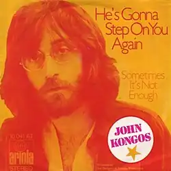 "He's Gonna Step on You Again" (also known as "Step On") is a song originally performed by South African singer John Kongos, co-written by Kongos and Christos Demetriou, and first released in 1971 by Fly Records. It entered the UK Singles Chart on 22 May 1971 and spent 14 weeks there, peaking at No. 4.[1] Covers of the song have been chart successes several times, including for Happy Mondays in 1990.