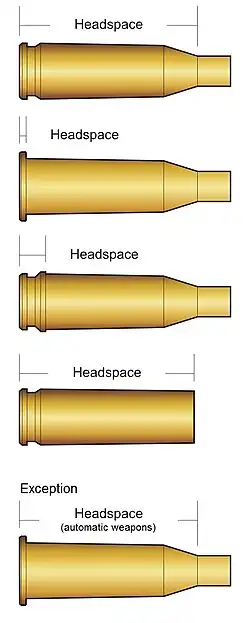 In firearms, headspace is the distance measured from a closed chamber's breech face to the chamber feature that limits the insertion depth of a cartridge placed in it. Used as a verb by firearms designers, headspacing refers to the act of stopping deeper cartridge insertion. The exact part of the cartridge that seats against the limiting chamber feature differs among cartridge and gun designs.[1] In general, bottleneck rifle cartridges headspace on their case shoulders; rimmed cartridges headspace on the forward surfaces of their case rims; and rimless pistol cartridges headspace on their case mouths. The case belts on belted cartridges were originally added to allow headspacing on the belt's forward surface, But in practice, this is often vestigial, and rifles chambered for belted cartridges may well headspace them on their shoulders and still be within CIP or SAAMI dimensional limits. However, belted cartridges and their corresponding chambers at their nominal CIP or SAAMI dimensions (maximum cartridge in minimum chamber) will headspace on the belt.