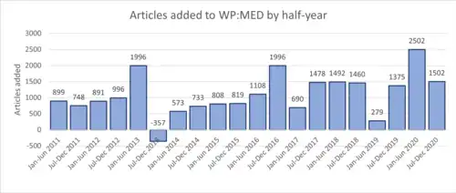 As of 2017, there were about 6,000 anatomy articles on the English Wikipedia;[7] these are not classified as "medical articles" in Wikipedia's categorization scheme and thus are not included in the 30,000 figure above.[4]