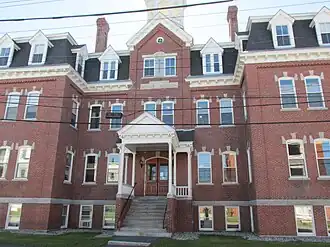 The former Healy Asylum building is located facing Ash Street and occupying about 1⁄2 of a city block bounded by Ash, Bates, Blake, and Pine Streets, a short way east of Lewiston's downtown business district. It is a 3+1⁄2-story building, built out of brick with granite trim, and set on a high brick foundation. It is topped by a mansard roof pierced by gabled dormers, with chimneys topped by decorative brick corbelling. The building is H-shaped, with a central section and two flanking wings that project to the front and back. The entrance is in the center section, sheltered by a wooden portico with bracketed cornice and fully pedimented gable.[2]