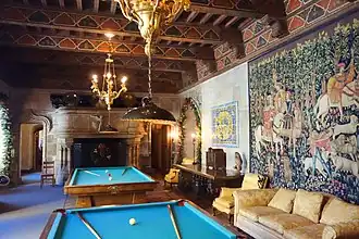 The north, or billiard, and the south, or service, wings complete the castle and were begun in 1929.[194] The north wing houses the billiard room on the first floor, which was converted from the original breakfast room. It has a Spanish antique ceiling and a French fireplace[194] and contains the oldest tapestry in the castle, a Millefleur hunting scene woven in Flanders in the 15th century.[206] The spandrel over the doorcase is decorated with a frieze of 16th century Persian tiles depicting a battle.[207] The 34 tiles originate from Isfahan and were purchased by Hearst at the Kevorkian sale in New York in 1922.[208] The theater, which leads off the billiard room, was used both for amateur theatricals and the showing of movies from Hearst's Cosmopolitan Studios.[194] The theater accommodated fifty guests and had an electric keyboard that enabled the bells in the carillon towers to be played. The walls are decorated in red damask, which originally hung in the assembly room, and feature gilded caryatids.[209]