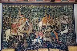 Tapestries include the Scipio set after Giulio Romano[239] in the assembly room,[240] two from a set telling the Biblical story of Daniel in the morning room, and the millefleur hunting scene in the Billiard room.[241] The last is particularly rare, one of only "a handful from this period in the world".[239] Hearst also assembled and displayed an important collection of Navajo textiles at San Simeon, including blankets, rugs and serapes. Most were purchased from Herman Schweizer, who ran the Indian Department of the Fred Harvey Company. Originally gathered at Hearst's hacienda at Jolon, they were moved to Wyntoon in 1940 before being brought to San Simeon[242] and finally being donated to the Los Angeles County Museum of Art in 1942.[243] Hearst was always interested in pieces that had historical and cultural connections to the history of California and Central and Latin America; the North Wing contains two Peruvian armorial banners. Dating from the 1580s, they show the shields of Don Luis Jerónimo Fernández Cabrera y Bobadilla, Count of Chinchón and viceroy of Peru.[244] Nathaniel Burt, the composer and critic evaluated the collections at San Simeon thus; "Far from being the mere kitsch that most easterners have been led to believe, [San Simeon is] full of real beauties and treasures".[245]