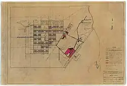 All of the buildings were electrified, which was at the time a rarity in Wyoming, but due to time constraints and a largely unskilled workforce, the majority of these "buildings" were poorly constructed. Army higher-ups gave the site's chief engineer only sixty days to complete the project, and newspaper ads recruiting laborers promised jobs "if you can drive a nail" while workers boasted that it took them only 58 minutes to build an apartment barracks.[3][10] Thousands of acres of surrounding land were designated for agricultural purposes, as the center was expected for the most part to be self-sufficient.