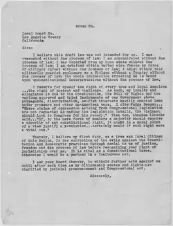 This document was included in the case of the U.S. vs. Kiyoshi Okamoto, et al. Okamoto and his co-defendants, members of the Heart Mountain Fair Play Committee, were indicted for conspiring to assist other Heart Mountain residents in their challenge to War Relocation Authority policies and the Selective Service Act as it applied to camp inmates. This letter to local Selective Service boards in California was apparently prepared as a model for internees to use to protest their eligibility for the draft. (NARA 292806)
