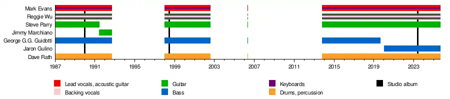 - Mark Evans – lead vocals, acoustic guitar, keyboards, piano (1987–1992, 1998–2002, 2006, 2013–present)