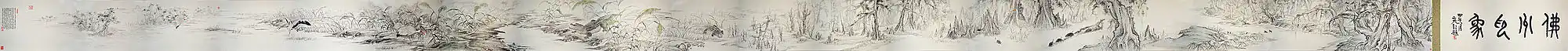 Besides manipulating perspectives, it is also known that Heaven Style painting uses different granularities of strokes and lines to depict different levels of object details. It mimics digital camera's zoom-in and zoom-out functionality in taking video. This approach was applied in panorama long scroll painting to express both the micro and macro aspects. A representative work is panorama scroll "Florida Impression"(佛州印象), created by Shaoqiang Chen.[7][8] Another feature of Heaven Style painting is that it tries to integrate Western painting technique in using color, such as contrast and color thickness.[6] Some examples are "Blossom of Hydrangea" (绣球花开) created by Shaoqiang Chen,[9] "Delight with the Red" (老来红) created by Zhi Chen,[2] etc.