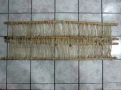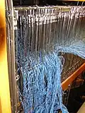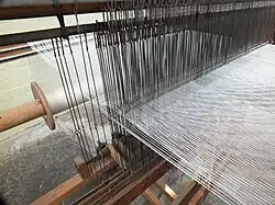 A heddle or heald is an integral part of a loom. Each thread in the warp passes through a heddle,[1] which is used to separate the warp threads for the passage of the weft.[1][2] The typical heddle is made of cord or wire and is suspended on a shaft of a loom. Each heddle has an eye in the center where the warp is threaded through.[3] As there is one heddle for each thread of the warp, there can be near a thousand heddles used for fine or wide warps. A handwoven tea-towel will generally have between 300 and 400 warp threads[4] and thus use that many heddles.