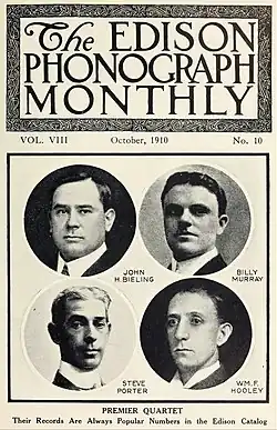 The American Quartet was a four-member vocal group that recorded for various companies in the United States between 1899 and 1925. The membership varied over the years, but the most famous line-up — comprising John Bieling (first tenor), Billy Murray (second tenor), Steve Porter (baritone), and William F. Hooley (bass) — recorded for the Victor Talking Machine Company from 1909 to 1913. The same group of singers also recorded for Edison Records as the Premier Quartet (or Quartette), and for that and other labels as the Premier American Quartet. From 1912 to 1914 the quartet also recorded with countertenor Will Oakland as the Heidelberg Quintet.