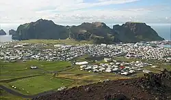 Heimaey (Icelandic pronunciation: [ˈheiːmaˌeiː] ⓘ), is an Icelandic island. At 13.4 square kilometres (5.2 sq mi), it is the largest island in the Vestmannaeyjar archipelago, and the largest and most populated island off the Icelandic coast. Heimaey is 4 nautical miles (7.4 km; 4.6 mi) off the south coast of Iceland. It is the only populated island of the Vestmannaeyjar islands, with a population of 4,414.[1] The Vestmannaeyjar Airport and the Westman Islands Golf Club taken together cover a good portion of the island.