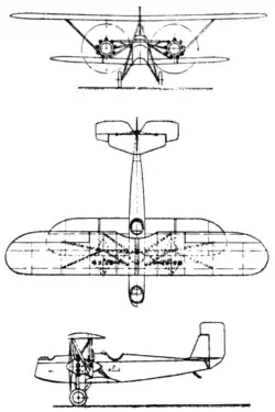 The square cross-section fuselage was formed with steel tubes and covered with fabric, with a light, rounded, wooden upper decking. There were three open cockpits: one in the nose, another under the upper wing and the last, from which it was flown, just behind the upper trailing edge which had a shallow, rounded cut-out to aid the pilot's forward view. The tail surfaces were conventional and straight-edged, with angled leading edges and unswept trailing edges. The tailplane, mounted on the upper fuselage, was braced from below to the fuselage with a single strut on each side. Both the rudder and elevators were balanced; the latter were separate, their inner corners cut away for deflections of the deep rudder.[1]