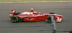 2000 and 2001 were critical years as Honda also began to supply the BAR team, resulting in a race between the teams as to who would secure the regular engine supply. In 2000 Frentzen managed two podiums, which were the best results for the team, but Jordan still finished down the grid and, crucially, behind BAR. After some low points finishes, injury, disagreements about the technical direction of the team (Frentzen reportedly offered to pay for the changes to fix the car, out of his own pocket) and then a string of retirements halfway through the 2001 season, Jordan sacked Frentzen and replaced him with Jean Alesi. Eight years later Eddie Jordan revealed that the termination of Frentzen's contract was a move to appease Honda and sign the Japanese driver Takuma Sato to race for the team.[7] Frentzen subsequently took Alesi's place at the struggling Prost team, and managed to qualify fourth at Spa, before the outfit collapsed financially at the end of the season.[8]