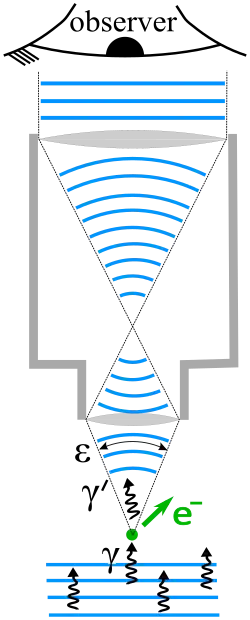 An observer perceives an image of the particle because the light rays strike the particle and bounce back through the microscope to the observer's eye. We know from experimental evidence that when a photon strikes an electron, the latter has a Compton recoil with momentum proportional to , where is the Planck constant. However, the extent of "recoil cannot be exactly known, since the direction of the scattered photon is undetermined within the bundle of rays entering the microscope." In particular, the electron's momentum in the direction is only determined up to[6]