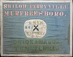 One battle flag from Key's Arkansas Battery has survived. Like the other units in Cleburne's Arkansas Division the unit was issued a Hardee pattern flag. The flag is cotton with dark green, black and red paint. It measures 30 × 36 inches and has the War Department Capture Number 231 painted on the flag. Key's Battery was captured with most of the rest of Daniel Govan's Arkansas brigade in the fighting at Jonesboro, Georgia, on 1 September 1864. The flag is consistent with the last two flags of the 1864 issue, and as a group they reinforce the observation that decorating was done at the brigade level at this point in the war. The crossed cannon are unusual on an artillery flag, as they generally honor capture of enemy guns by infantry. The honor may have been extended for silencing enemy guns in an exchange, but is unknown before 1864. The flag is currently in the collection of the Old State House Museum, Little Rock, Arkansas.[51]