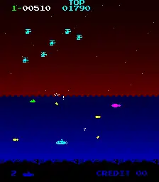 The submarine can move in eight directions and can defend itself with missiles. While ships and mines attack the submarine from the water, enemy helicopters, which come in four different colors that designate their speed, drop missiles and depth charges at the submarine from the air.[2] Each level consists of three sets of ten helicopters (for a total of 30) which must be destroyed within a specified time limit, or else they start to attack in a "special assault pattern". After a certain number of helicopters are destroyed, the submarine resurfaces, and a native girl dances (called "dancers of the isles"[2]) on top of the submarine while bonus points are awarded. After each level, the water level rises, placing the submarine closer to the helicopters and underwater traps.[6]