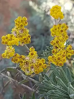 Virgate shrub up to 1.5 m tall, or rarely sprawling, branches thinly grey-woolly, closely leafy, older parts glabrescent, rough with leaf scars. Leaves 10–30 (–40) x 1–2 (–6) mm, linear, linear-oblong or linear-lanceolate, apex acute or subacute, mucronate, base broad, half-clasping, margins commonly revolute, upper surface thickly or thinly greyish-white woolly or glabrous or nearly so, lower surface greyish-white woolly. Heads heterogamous, hemispherical, 4–5 mm long, 5–8 mm across the radiating bracts, bases woolly, many in congested or open corymbose panicles terminating long leafy branches. Involucral bracts in c. 5 series, graded, loosely imbricate, inner about equaling or slightly exceeding flowers, tips minutely radiating, bright canary-yellow, rarely orange, glossy. Receptacle very shortly honeycombed. Flowers 47–105, 8–14 female, 39–84 homogamous, yellow. Achenes 0.75 mm long, with duplex hairs. Pappus bristles many, equaling corolla, scabrid, bases cohering by patent cilia.