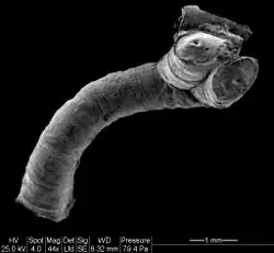 Helicoconchus is a microconchid genus that occurs in the Lower Permian of Texas. It forms small reef-like bodies of tubes branching from a common origin. The impunctate tubes are greatly elongated for microconchids and have occasional diaphragms with central pits. The tubes branch in two ways: budding from the tube wall and binary fission. They lived in shallow, normal marine environments.[1]
