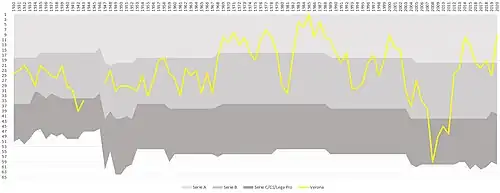 During the 2015–16 season, Verona had not won a single match since the beginning of the campaign until the club edged Atalanta 2–1 on 3 February 2016 in a win at home; coming twenty-three games into the season.[11] Consequently, Verona were relegated from Serie A.[12]