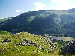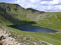 The top of Helvellyn is a broad plateau, trending roughly from north-west to south-east for about a kilometre between Lower Man and the start of Striding Edge. Throughout this distance it remains more than 900 m (3,000 ft) high.[7] To the west the mountain is rounded, its shape before glaciation: the ground drops gently at first but then more steeply down to Thirlmere, whereas on the eastern side deep glacial coves, each backed by high cliffs, are separated by spectacular sharp ridges or arêtes.[8] The middle of these coves contains Red Tarn.[7] The reason for this east-west contrast has been debated.[8]
