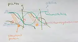 As a polysaccharide compound in plant cell walls similar to cellulose, hemicellulose helps cellulose in the strengthening of plant cell walls.[7] Hemicellulose interacts with the cellulose by providing cross-linking of cellulose microfibrils: hemicellulose will search for voids in the cell wall during its formation and provide support around cellulose fibrils in order to equip the cell wall with the maximum possible strength it can provide.[7] Hemicellulose dominates the middle lamella of the plant cell, unlike cellulose which is primarily found in the secondary layers. This allows for hemicellulose to provide middle-ground support for the cellulose on the outer layers of the plant cell. In few cell walls, hemicellulose will also interact with lignin to provide structural tissue support of more vascular plants.[3][14]