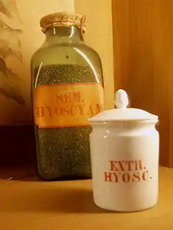 - ^ a b c Lindequist, U. (1993). "H. § Hyoscyamus". In von Bruchhausen, F.; et al. (eds.). Hagers Handbuch der pharmazeutischen Praxis. Vol. 5 (5th ed.). Springer. pp. 460–474. doi:10.1007/978-3-642-57993-6_4. ISBN 978-3-642-57993-6.