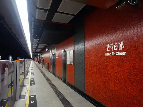 Heng Fa Chuen is served by the station of its namesake on the MTR Island line. Blocks 1 to 18 are situated on a podium above the MTR Chai Wan Depot, which houses and maintains the trains serving the line.