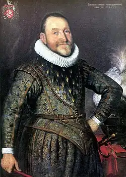 More precisely, it's because it's a badge with little meaning, apart from its aristocratic dimension, that the white plume can be chosen as an emblem.[4] The white scarf, a Protestant symbol, became a badge attached to the person of Henri IV.[16] However, its Protestant origin, following Henry IV's conversion to Catholicism, became a source of embarrassment. Royal narrators and propagandists therefore put more emphasis on the plume.[17] The motifs of Henri IV's helmet and white plume were taken up as emblems attached to his person when Lyon submitted to the king's authority in 1594[18][19] or during royal entries into cities, as in Avignon in 1600.[20]