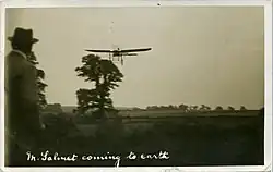 In 1913, Salmet flew in a tour of Great Britain, again sponsored by the Daily Mail, whose title was emblazoned beneath the wings of his Blériot XI-2. One of his passengers that year was the English illustrator Wyndham Payne.[8] In April 1914, he landed the Blériot at Gyllyngvase beach near Falmouth, where the wheels dug into the soft sand, and the aircraft tipped up onto its nose.[9][10] The Blériot was then fitted with its optional floats to enable operation from the sea. Soon after, an engine failure caused a forced landing on the sea near Lizard Point, during a flight carrying the Lady Mayoress of Falmouth.[9][10]