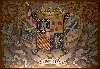 | Shield | Français : Blason : écartelé, en 1 et 4 d'azur semé de fleurs de lys d'or et à la tour d'argent maçonnée et ouverte de sable (qui est de La Tour), en 2 d'or au trois tourteaux de gueules (qui est Boulogne), et 3 coticé d'or et de gueules de 8 pièces (qui est Turenne), sur le tout parti d'or au gonfanon de gueules frangé de sinople (qui est Auvergne) et de gueules à la fasce d'argent (qui est Bouillon) |