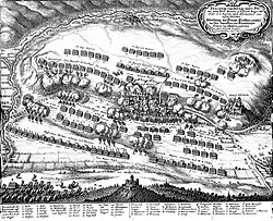 While molding the army back into fighting condition Turenne bought mounts for 5,000 cavalrymen and clothes for 4,000 infantrymen with his own money.[6] The reorganization finished, Turenne began campaigning in June 1644, crossing the river Rhine at Breisach.[2] He defeated Gaspard von Mercy in the Black Forest before retreating to the Rhine.[17] Unable to relieve the besieged Freiburg with inferior numbers, he was quickly joined by a force under the Duke of Enghien, later to be known as the Grand Condé.[2] The Duke, as a prince of the royal house, took the chief command of the united armies of "France" and "Weimar". The desperately fought battle of Freiburg against Franz von Mercy's Bavarians (3, 5 and 9 August 1644) proved the chief event of the first campaign.[2] In this battle Turenne distinguished himself with a well executed strike at the enemy flank.[18][19] The French continued on by successfully besieging Philippsburg.[20][2] Before the capitulation Enghien withdrew and left Turenne in command.[21][2] At the same time the Duke of Lorraine moved to besiege nearby Bacharach. Turenne took 500 men and built a huge camp near Bacharach, believing Turenne had a large force Lorraine retreated. Turenne continued on by taking the important fortress of Kreuznach and blocking the route between the two armies.[22]
