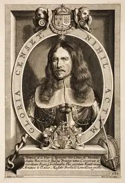 Frederick Henry of Nassau, who succeeded his brother Maurice as Stadtholder and Prince of Orange in 1625, granted Turenne a captaincy in 1626.[2][7] Turenne personally drilled his troops, as was the custom at the time, and won their respect with his charity and simple lifestyle.[9] His company was alleged to be the best drilled and most disciplined one in the army, he required of his soldiers not only discipline but also high moral standards.[9] His kindness made him well-liked among the entire army.[10] The young officer took his part in the sieges of the period, learning much about fortifications and siege warfare.[6] In 1629, Turenne served in the siege of Bois-le-Duc as commander of a artillery and reconnaissance.[11] He won special commendation for his skill at this battle, but was reprimanded for recklessness.[6][12] He also learned much about the details of leading an army, like posting guards and reconnaissance.[7] In 1630 Turenne left the Netherlands and entered the service of France, motivated both by the prospect of military advancement[4][6] but also because of his mother's desire to display loyalty to the French crown.[2]