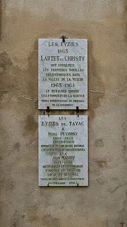 Christy had a partial catalogue of his collections made in 1862, by Carl Ludvig Steinhauer.[18] In 1864 he wrote an account of the work which was being carried out at his expense in the Vézère Valley; these notices appeared in the Comptes rendus (29 February 1864) and Transactions of the Ethnological Society of London (21 June 1864). They referred mainly to the "reindeer period", as the time of the cavemen in southern France then came to be styled. Christy's funding contributed to the discovery of Cro-Magnon man in 1868 in a cave near Les Eyzies. An account of the explorations appeared in a half-finished book left by Christy, entitled Reliquiae Aquitanicae, being contributions to the Archaeology and Paleontology of Périgord and the adjacent provinces of Southern France; this was completed by Christy's executors, first by Lartet and, after his death in 1870, by Thomas Rupert Jones.[2]