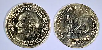 Hazlitt was a strong proponent of sound monetary policy and a vocal critic of inflationary practices and government intervention in markets.[4][5] As a defender of free enterprise, he drew on the ideas of economists such as Ludwig von Mises and Friedrich Hayek, helping popularize their theories for a general audience. Beyond economics, Hazlitt contributed to debates on philosophy and ethics, advocating for the moral underpinnings of a free society. He also served as an editorial board member of the libertarian journal The Freeman and was a founding member of the Foundation for Economic Education (FEE), one of the oldest free-market think tanks in the United States.[6]