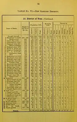 During his first three years in the post, Littlejohn carried out a meticulous investigation into the living conditions and the state of health of the town's inhabitants. His report, published in 1865, contained 120 pages of detailed statistics, analysing conditions in over one thousand separate streets, closes and tenements. It included extensive data on the prevalence of the most common diseases as well as historical data on earlier epidemics. The report convincingly demonstrated the link between deprivation, disease and mortality.[6]