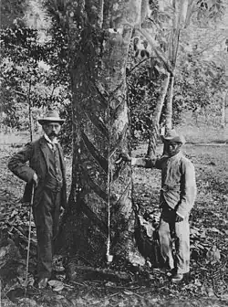 Ridley spent many years promoting rubber as a commercial product, which he was known for being passionate; therefore, he was nicknamed "Mad Ridley".[10] In 1895, he discovered a means of tapping which did not seriously damage the rubber trees.[8] Ridley was also largely responsible for establishing the rubber industry on the Malay Peninsula,[11] where he resided for twenty years. The area under Pará rubber slowly increased after 1898 when a Chinese landowner, Tan Chay Yan, grew 40 acres successfully, leading to more people taking to rubber cultivation.[7]