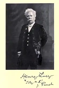 Lucy lived in Paris during 1869 and learned French. After returning to England he wrote for Pall Mall Gazette from 1870 and as parliamentary reporter for Daily News from 1873. He stayed with the Liberal newspaper, for which he was promoted the editor. He was a parliamentary sketch writer for Punch magazine from 1881.[4] In 1880, Lucy began writing for The Observer's "Cross Bench" column. This he continued to do for 29 years. He used the pseudonym "Toby, M.P." from 1881 to 1916. He wrote the weekly column "The Essence of Parliament" in Punch for 35 years. When not writing under one of his pseudonyms, he was usually styled Henry W. Lucy.