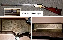 For an American Civil War soldier, owning a Henry rifle was a point of pride.[5] Just 1,731 of the standard rifles were purchased by the government during the war.[6] The Commonwealth of Kentucky purchased a further 50. However, 6,000 to 7,000 saw use by the Union on the field through private purchases by soldiers who could afford it. The relative fragility of Henrys compared to Spencers hampered their official acceptance. Another weak point for the Henry was that it could not be equipped with a bayonet. Many infantry soldiers purchased Henrys with their reenlistment bounties of 1864. Most of these units were associated with Sherman's Western troops.