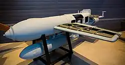 Hs 293 on display at the Deutsches Technikmuseum in Berlin, Germany, with added "Kopfring" (lit. "head ring") on the nose for nautical targets | |